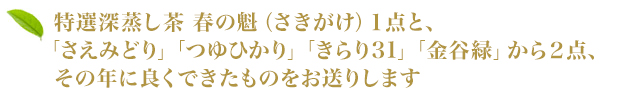 | 内容量 | 特選深蒸し茶 春の魁(さきがけ)100g 1点 ▼その年の中でよくできたもの2点 さえみどり 100g つゆひかり 100g きらり31 100g 金谷緑 100g |