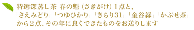 | 内容量 | 特選深蒸し茶 春の魁(さきがけ)100g 1点 ▼その年の中でよくできたもの2点 さえみどり 100g つゆひかり 100g きらり31 100g 金谷緑 100g かぶせ茶 100g |